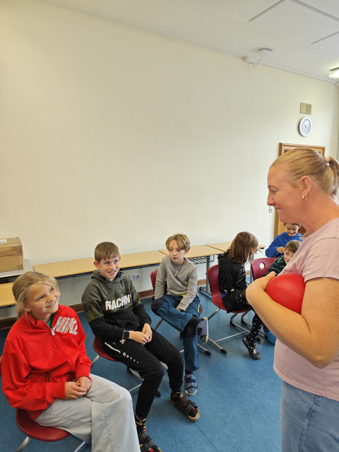 Mit einer fröhlichen Vorstellungsrunde ging es los: Jedes Kind durfte seinen Namen, seine Hobbys und sein Lieblingstier vorstellen – dabei wurde viel gelacht und aufmerksam zugehört. Besonders kreativ wurde es beim Spiel „Namensball“, bei dem zu jedem Namen ein passendes Lieblingswort mit dem gleichen Anfangsbuchstaben genannt wurde. So erfuhren die Kinder nicht nur, dass Frau Schlegel gerne Schokolade isst, sondern lernten auch viel über die Vorlieben ihrer Klassenkameradinnen und -kameraden.